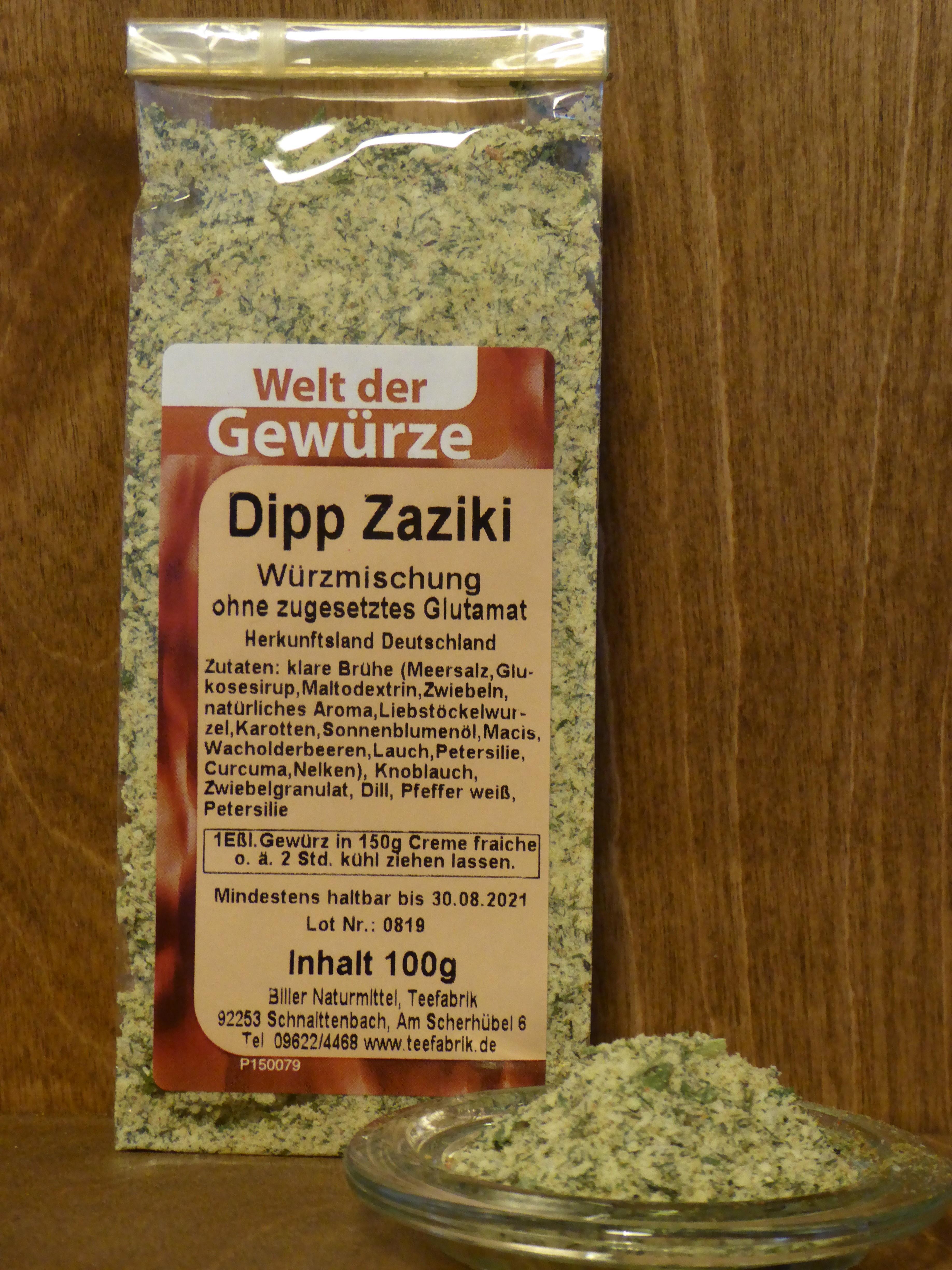 Curcuma, Nelken), Knoblauch, Zwiebelgranulat, Dillspitzen, Pfeffer weiß, Petersilie
